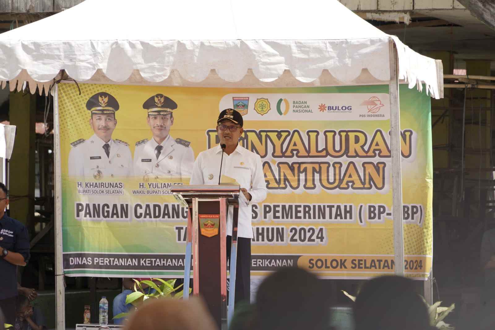 Hal ini disampaikan langsung oleh Bupati Solok Selatan H. Khairunas di sela-sela penyerahan Bantuan Beras Cadangan Pangan Pemerintah (BP-CBP) di Pasar Sungai Kalu, Nagari Pakan Rabaa Utara, Kecamatan KPGD, Rabu (5/6/2024).