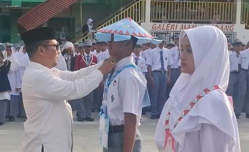 Pembukaan Matsama yang diikuti siswa baru ditandai dengan pemasangan tanda peserta kepada dua perwakilan siswa berupa topi dan papan nama.
