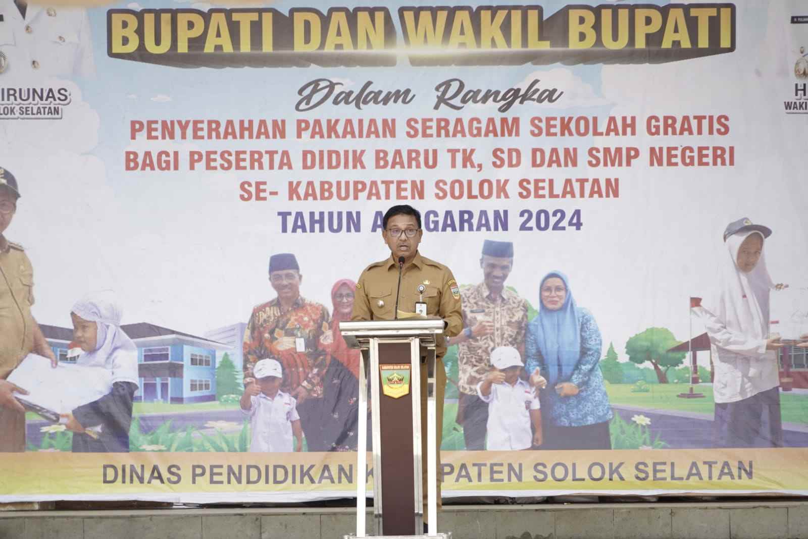 SOLOK SELATAN, HARIANHALUAN.ID- Pembagian seragam sekolah gratis kembali dilakukan oleh Pemerintah Kabupaten (Pemkab) Solok Selatan, kali ini menyasar sekolah TK-SMP yang ada di Kecamatan Sungai Pagu, di Lapangan RTH Muaralabuh, Selasa (30/7).