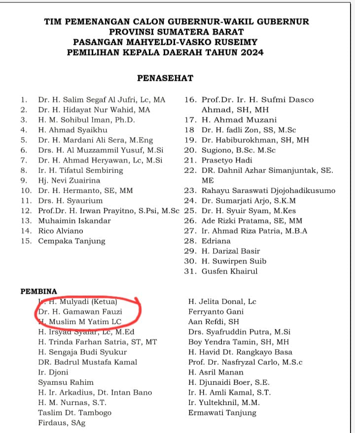 Sebelumnya, beredar surat berformat PDF yang diduga surat daftar tim pemenangan Mahyeldi-Vasko. Surat itu bertuliskan “TIM PEMENANGAN CALON GUBERNUR-WAKIL GUBERNUR PROVINSI SUMATERA BARAT PASANGAN MAHYELDI-VASKO RUSEIMY PEMILIHAN KEPALA DAERAH TAHUN 2024”. Surat tertanggal 6 September itu berisi tanda tangan dan nama Mahyeldi sebagai calon gubernur dan nama Vasko Ruseimy sebagai calon wakil gubernur. Dalam surat itu tertulis “Dr. H. Gamawan Fauzi” sebagai pembina.