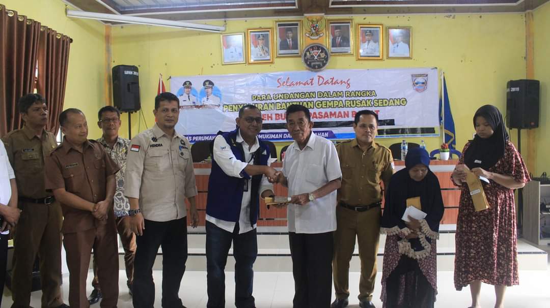PASBAR, HARIANHALUAN.ID- Sekretaris Daerah (Sekda) Kabupaten Pasaman Barat (Pasbar), Hendra Putra menyalurkan 45 unit bantuan gempa kategori rusak sedang di Kantor Wali Nagari Kajai, Selasa (1/10/2024).