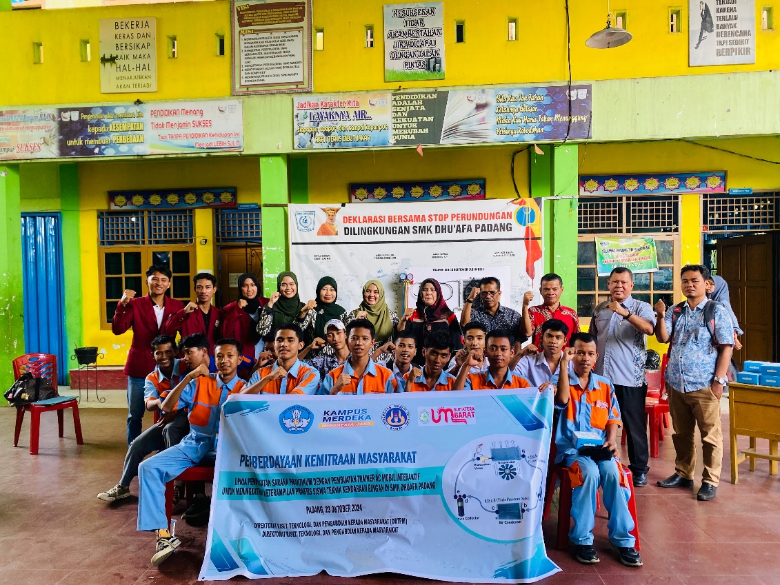 Program PKM ini bertujuan memfasilitasi siswa SMK Dhuafa Padang dengan sarana praktik memadai melalui pembuatan trainer AC mobil interaktif, guna mendukung pembelajaran yang lebih aplikatif dan relevan. Selain itu, program ini juga bertujuan meningkatkan keterampilan praktis dan kompetensi siswa dalam perawatan serta perbaikan sistem AC kendaraan ringan, sesuai dengan kebutuhan industri otomotif masa kini, sehingga para siswa dapat lebih siap bersaing di dunia kerja.
