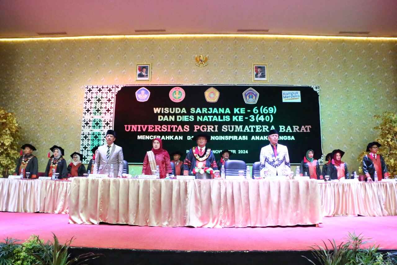 PADANG, HARIANHALUAN.ID- Universitas PGRI Sumatera Barat (UPGRISBA) menggelar wisuda ke-6 (69) dan Dies Natalis ke-3 (40) di gedung Universitas PGRI Convention Center (UPCC), Sabtu (16/11).