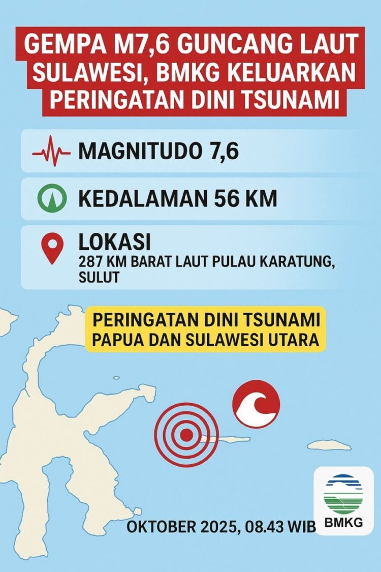 JAKARTA, HARIANHALUAN.ID — Gempa bumi berkekuatan Magnitudo 7,6 mengguncang wilayah laut di sebelah barat laut Pulau Karatung, Sulawesi Utara, pada Jumat (10/10) pukul 08.43 WIB.