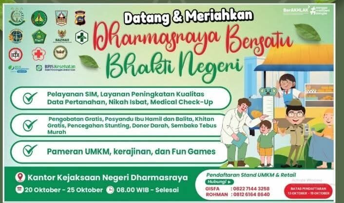 “Kami mengajak seluruh masyarakat Dharmasraya untuk hadir dan memanfaatkan layanan yang telah disiapkan bersama para mitra. Mari kita bersatu dalam semangat Bhakti Negeri untuk Dharmasraya yang lebih sejahtera,” katanya.