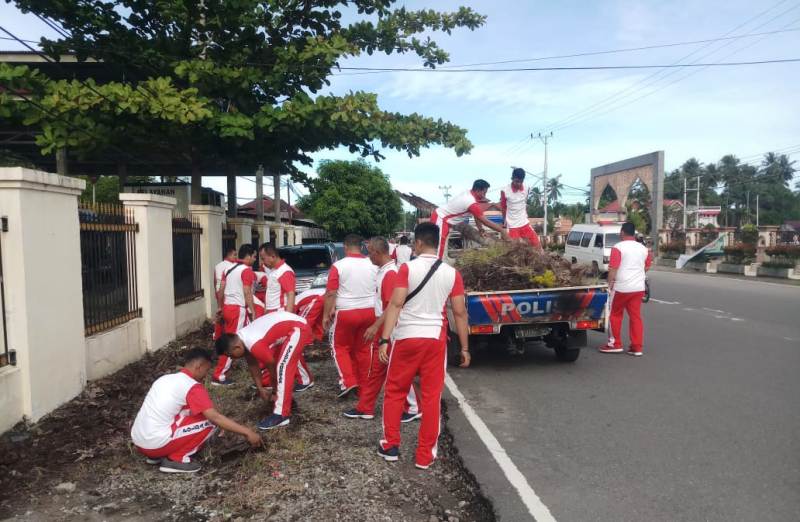 Personel Polres Pasbar setelah melaksanakan apel pagi yang dipimpin oleh Kabag Logistik Polres pasbar, AKP Teguh Priyatno. Kemudian seluruh personel melakukan gotong royong dengan membersihkan pekarangan di sekitaran mako, agar selalu terjaga kebersihan dan keindahannya.