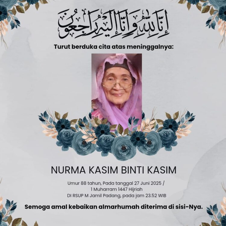 HARIANHALUAN.ID – Kota Padang kehilangan sosok wanita tangguh berhati mulia di penghujung bulan Juni. Nurma Kasim, seorang bidan senior yang telah melakukan banyak kebaikan terhadap sesama, menghembuskan nafas terakhirnya pada Jumat, 27 Juni 2025/1 Muharram 1447 H.