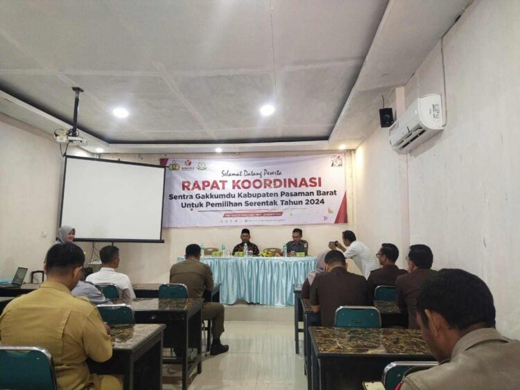 PASBAR, HARIANHALUAN.ID- Badan Pengawas Pemilu (Bawaslu) Kabupaten Pasaman Barat menggelar Rapat Koordinasi Sentra Gakkumdu untuk pemilihan serentak 2024, Senin (26/8) di aula hotel Gucci Simpang Empat.