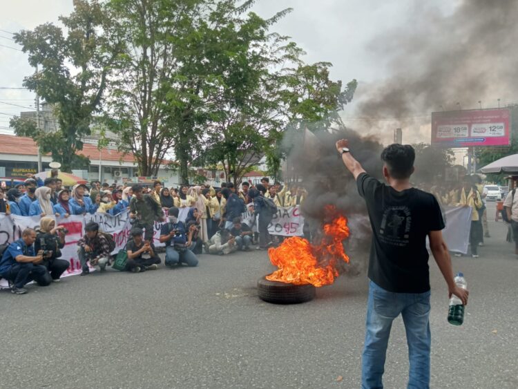 PADANG, HARIANHALUAN.ID – Ratusan massa yang tergabung dalam aliansi Badan Eksekutif Mahasiswa Sumatera Barat (BEM-SB) menggelar aksi unjuk rasa #IndonesiaGelap di halaman Kantor DPRD Sumbar, Selasa (18/2/2025).