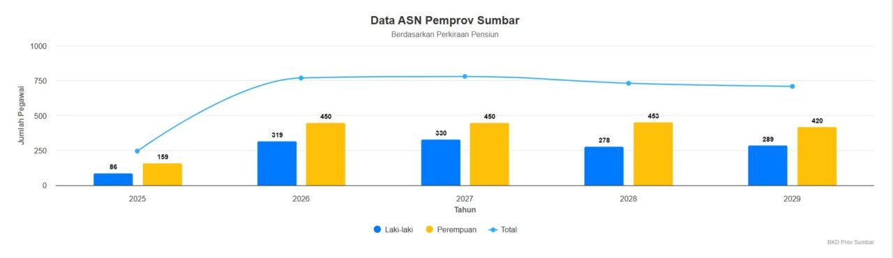 Berdasarkan data Badan Kepegawaian Daerah (BKD) Sumbar, total jumlah Aparatur Sipil Negara (ASN) aktif di lingkungan Pemprov Sumbar saat ini mencapai 20.247 orang, yang terdiri dari 361 Calon Pegawai Negeri Sipil (CPNS), 14.807 Pegawai Negeri Sipil (PNS), dan 5.579 Pegawai Pemerintah dengan Perjanjian Kerja (PPPK). Dilihat dari sebaran usia, BKD memprediksi, dalam lima tahun ke depan, rata-rata ada sekitar 700-an ASN Pemprov Sumbar yang akan pensiun per tahun.
