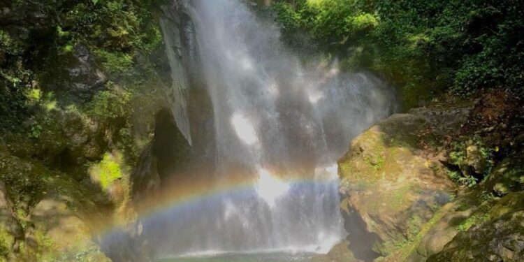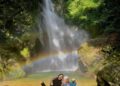 Keterangan Foto : Sejumlah wisatawan berfoto bersama di bawah Air Terjun Pelangi Lubuak Cukam, kawasan wisata alam yang kini kembali ramai dikunjungi....