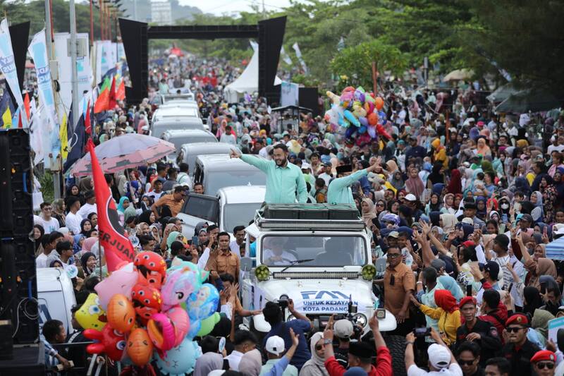 PADANG, HARIANHALUAN.ID – Kampanye pamungkas pasangan calon Wali Kota dan Wakil Wali Kota Padang, Fadly Amran dan Maigus Nasir di Danau Cimpago Pantai Muara Padang, Sabtu (23/11/2024). Ribuan warga dari 11 kecamatan mulai dari kader, simpatisan dan relawan memadati sepanjang jalan Pantai Padang itu.