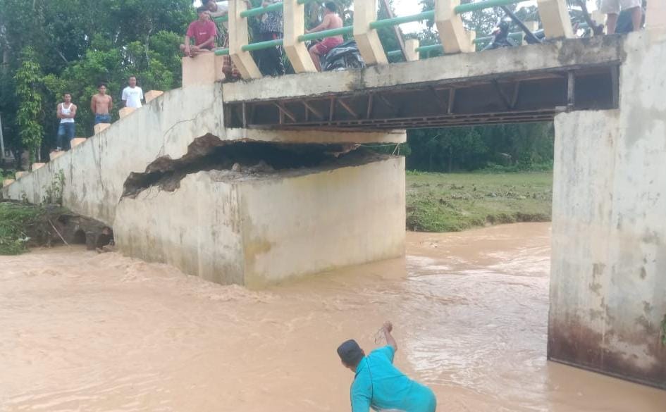 Kondisi jembatan penghubung antar nagari yang mengalami kerusakan akibat meluapnya Sungai Batang Kariang dan menggenangi rumah warga di dua jorong di Kenagarian Aie Amo, Kecamatan Kamang Baru. IST