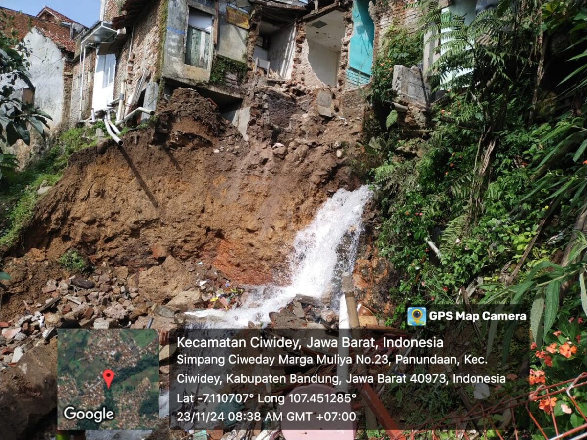 Longsor terjadi akibat dipicu hujan dengan intensitas tinggi terjadi di wilayah Desa Panundaan, Kecamatan Ciwidey. Tiga rumah terdampak dengan amblasnya tanah di teras rumahnya.