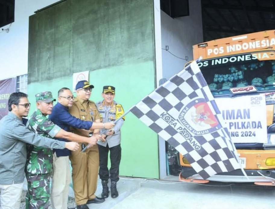 PADANG, HARIANHALUAN.ID- Penjabat (Pj) Wali Kota Padang Andree Algamar bersama unsur Forkopimda dan Ketua Komisi Pemilihan Umum (KPU) Kota Padang Dorri Putra, melepas secara langsung pendistribusian logistik Pemilihan Kepala Daerah (Pilkada) Serentak 2024 dari Gudang Logistik Komisi Pemilihan Umum (KPU) Kota Padang, Jalan Bypass Kilometer 19, Selasa (26/11/2024).