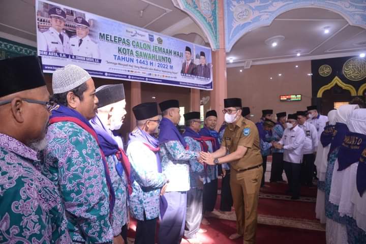 HALUANNEWS, SAWAHLUNTO – Wali Kota Sawahlunto Deri Asta melepas Calon Jemaah Haji (CJH) asal Kota Sawahlunto, di Masjid Agung Nurul Islam, Selasa (31/05/22).