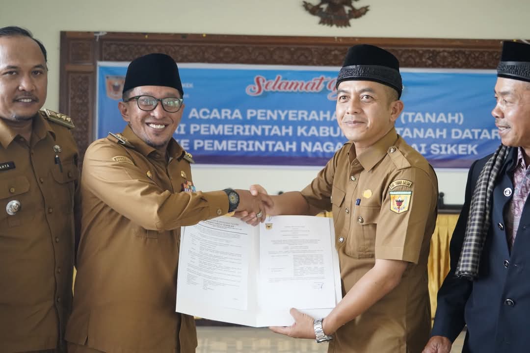 TANAH DATAR, HARIANHALUAN.ID- Bupati Tanah Datar Eka Putra, menyerahkan hibah barang berupa sebidang tanah dari Pemerintah Daerah Kabupaten Tanah Datar kepada Pemerintah Nagari Pandai Sikek, di Kantor Wali Nagari setempat, Senin (25/11/2024).
