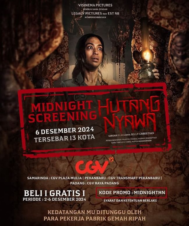 PADANG, HARIANHALUAN.ID – Film horor terbaru berjudul “Hutang Nyawa” memulai penayangan perdananya di Sumatera Barat (Sumbar) yakni bioskop CGV Raya Padang, Jumat (6/12/2024) malam pukul 21.30 WIB.