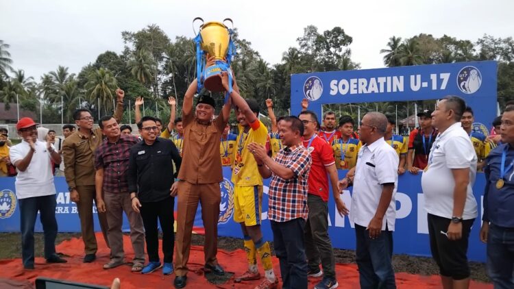 Teks Foto: Persikopa bersama PJ Walikota Pariaman, Roberia saat merayaka kemenangan Piala Soeratin U17 Sumbar. MITHA
