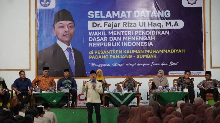 PADANG PANJANG, HARIANHALUAN.ID– Wakil Menteri Pendidikan Dasar dan Menengah Republik Indonesia, Dr. Fajar Riza Ul Haq, M.Si, M.A berbagi motivasi kepada para santri dalam kunjungannya ke Pesantren Kauman Muhammadiyah Padang Panjang, Sabtu (14/12/2024).