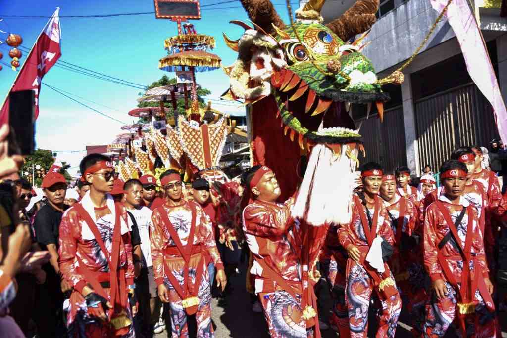 PADANG, HARIANHALUAN.ID- Ribuan masyarakat Kota Padang tumpah ruah memadati kawasan Kota Tua, Kecamatan Padang Barat untuk menyaksikan Carnaval Sepasan yang digelar oleh Himpunan Bersatu Teguh (HBT) Kota Padang, Selasa (31/12/2024).