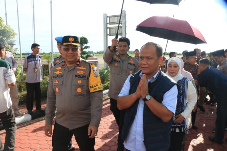 PADANG, HARIANHALUAN.ID — Wakapolda Brigjen Pol Gupuh Setiyono bersama Forkopimda Sumbar menyambut kedatangan Kapolda Irjen Pol Gatot Tri Suryanta di Bandara Internasional Minangkabau (BIM), Jumat (3/1/2025) sore.