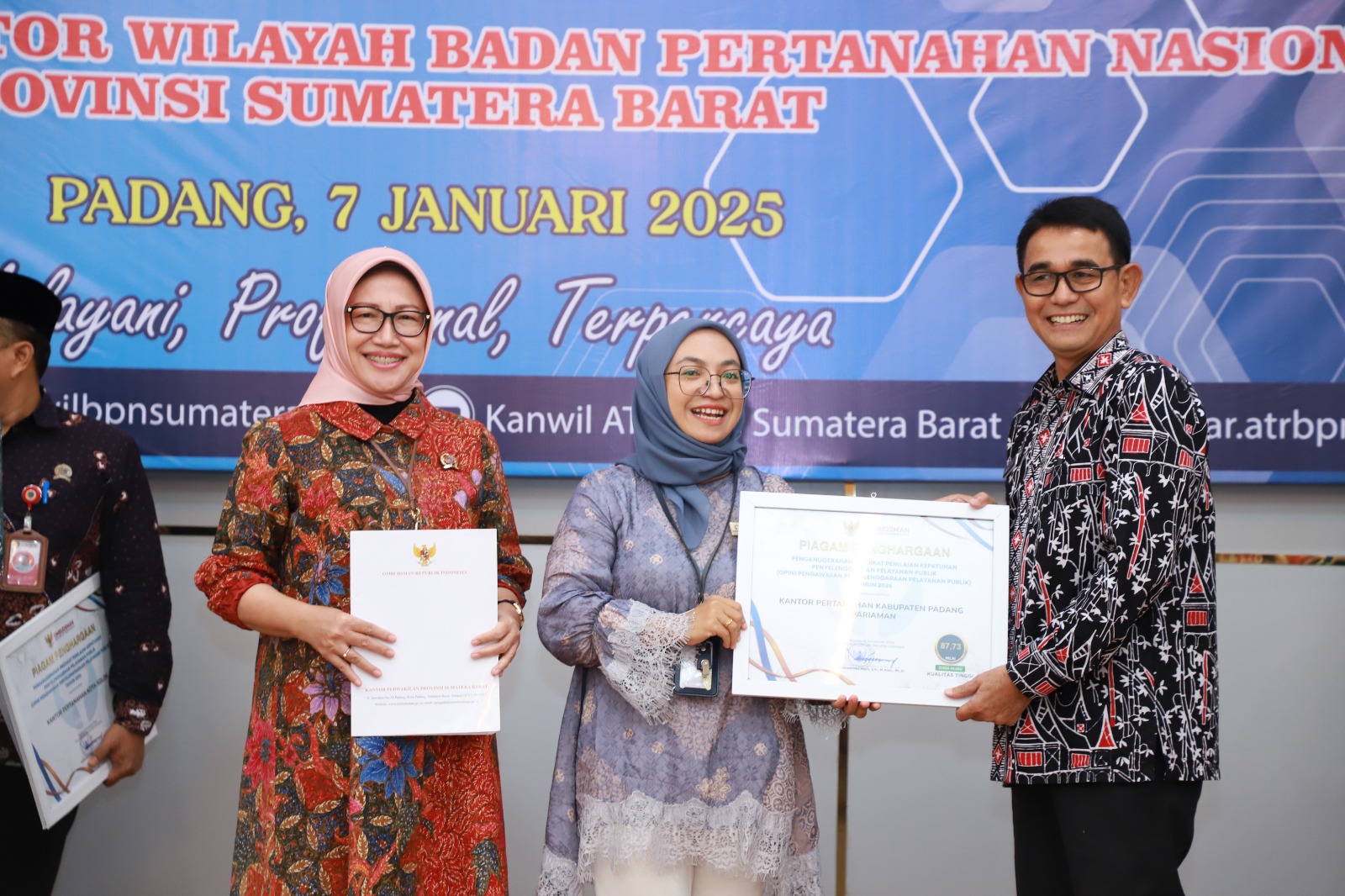 Penghargaan ini diterima langsung oleh Kepala Kantor Pertanahan setiap kabupaten/kota dan diserahkan oleh Pjs Kepala Perwakilan Ombudsman RI Sumatera Barat, Meilissa Fitri Harahap, serta Kepala Kanwil BPN Sumatera Barat, Sri Puspita Dewi.