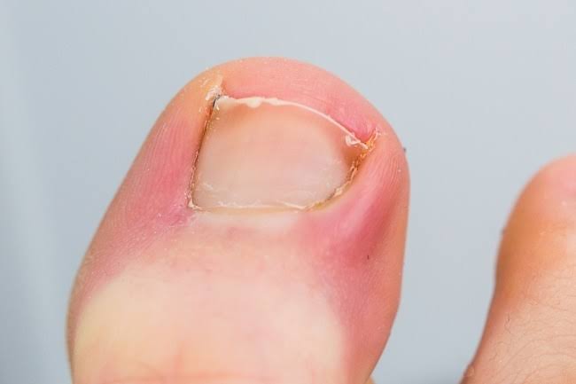 Kondisi ini sering terjadi pada jari kaki besar dan bisa disebabkan oleh pemotongan kuku yang tidak benar, cedera, atau pemakaian sepatu yang terlalu sempit.