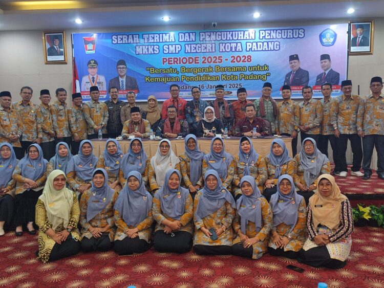 PADANG, HARIANHALUAN.ID – Kepala Dinas Pendidikan dan Kebudayaan (Kadisdikbud) Kota Padang, Yopi Krislova mengukuhkan pengurus Musyawarah Kerja Kepala Sekolah (MKKS) SMP Negeri Kota Padang pada Kamis (16/1/2025) di Hotel Rangkayo Basa, Padang.