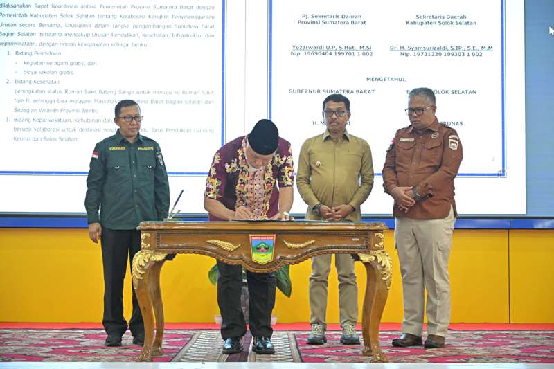 Nota kesepakatan bernomor 130/10/Pem/2025 itu ditandatangani Gubernur Sumbar, Mahyeldi Ansharullah dan Bupati Solok Selatan, Khairunas di Aula Sarantau Sasurambi, Kantor Bupati Solok Selatan, Sabtu (18/1) kemarin.
