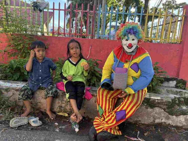 Dalam balutan kostum badut yang cerah dan penuh warna itu, ia berusaha menyuguhkan keceriaan kepada orang-orang yang lewat. Di balik topeng badutnya, tersembunyi air mata dan kisah hidup penuh perjuangan yang jarang diketahui banyak orang.