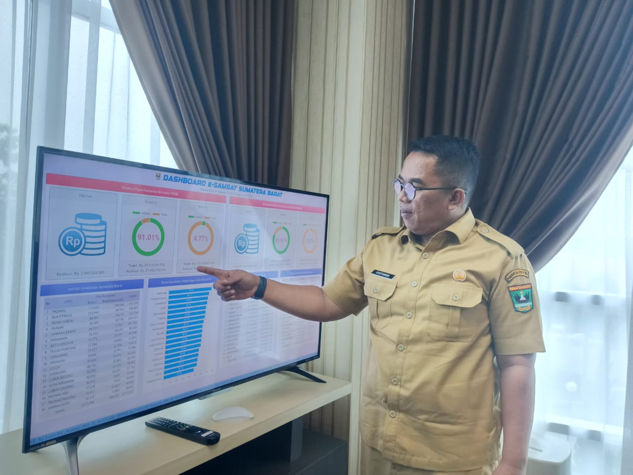 Teks Foto : Kepala Bapenda Sumbar Syefdinon memantau pergerakan realisasi pendapatan di 19 Kabupaten/Kota via Dashboard E-Samsat. Fauzi
