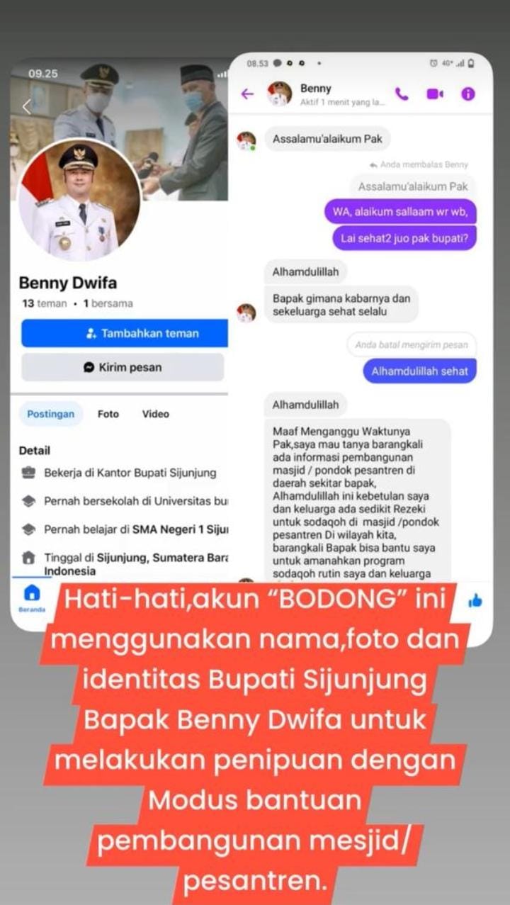 Akun tersebut diduga digunakan oleh pelaku penipuan untuk mengirimkan pesan kepada sejumlah warga di Kabupaten Sijunjung, mengklaim akan memberikan bantuan pembangunan masjid.
