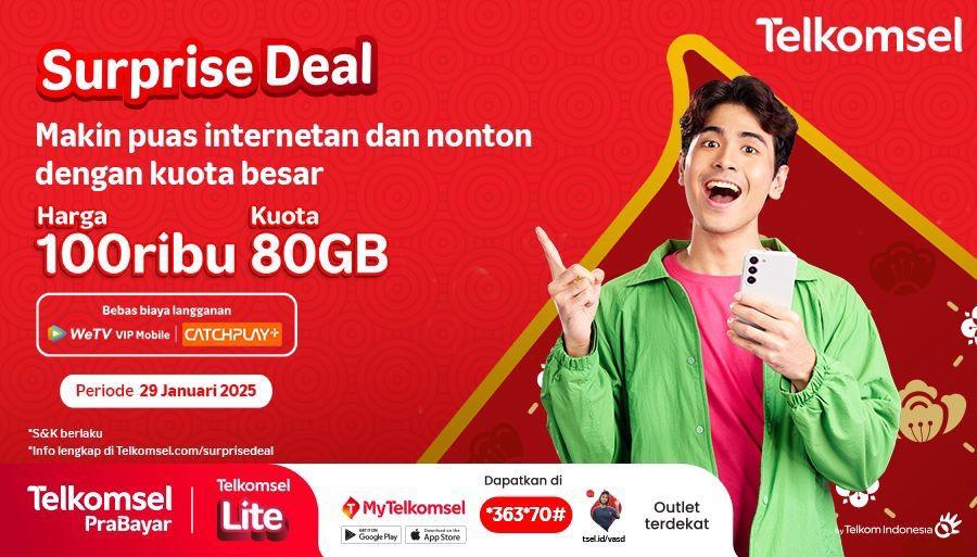 Melalui Surprise Deal kali ini, pelanggan dapat menikmati kuota internet 80 GB hanya dengan Rp100.000, yang dapat digunakan kapan saja. Selain itu, pelanggan juga mendapatkan bebas biaya langganan WeTV VIP Mobile dan Catchplay+, sehingga dapat menikmati berbagai konten hiburan premium secara gratis.