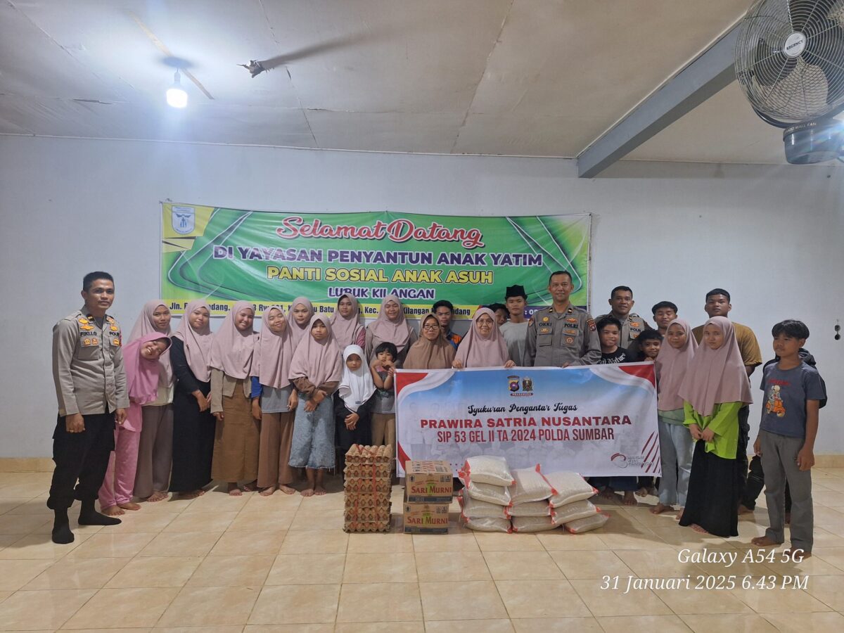 AGAM, HARIANHALUAN.ID – Sebagai wujud rasa syukur dan kepedulian terhadap sesama, Perwira Polda Sumatera Barat lulusan Sekolah Inspektur Polisi (SIP) Angkatan 53 gelombang II resimen Prawira Satria Nusantara (Prasanusa) menyerahkan sejumlah sembako ke Panti Sosial.