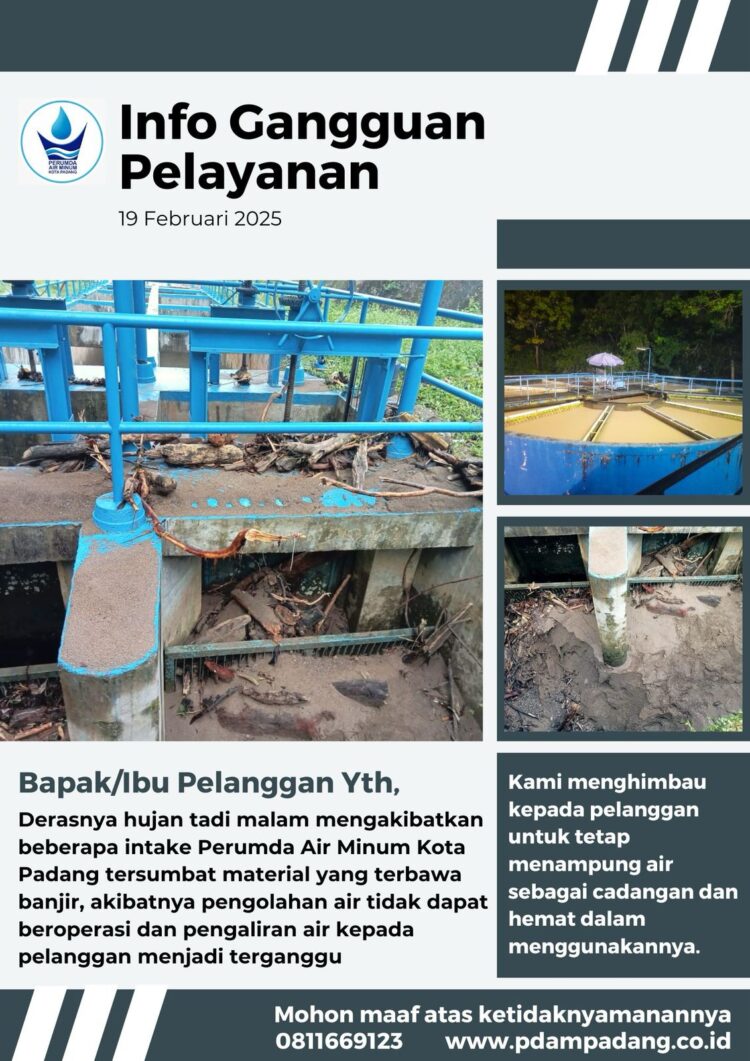 “Hal tersebut berimbas pada terjadinya gangguan pendistribusian air dibeberapa area pelayanan di Kota Padang. Perumda mengimbau agar warga memastikan ketersediaan air di rumah mencukupi,” katanya.