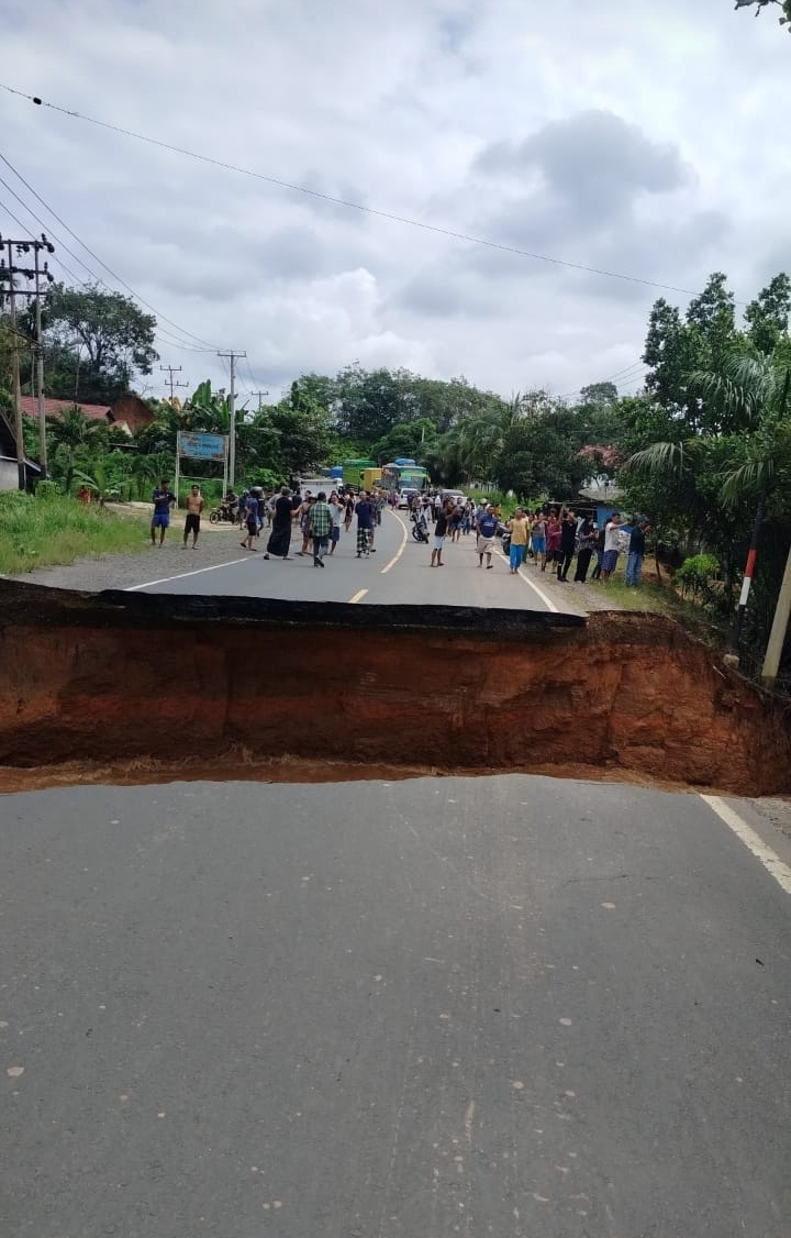 Informasi yang dirangkum Haluan mengatakan, sejak sore Sabtu (01/03) sampai Minggu (02/03) subuh, curah hujan tinggi, dan membuat air yang ada di bahu jalan melimpah dan menghanyutkan badan jalan.