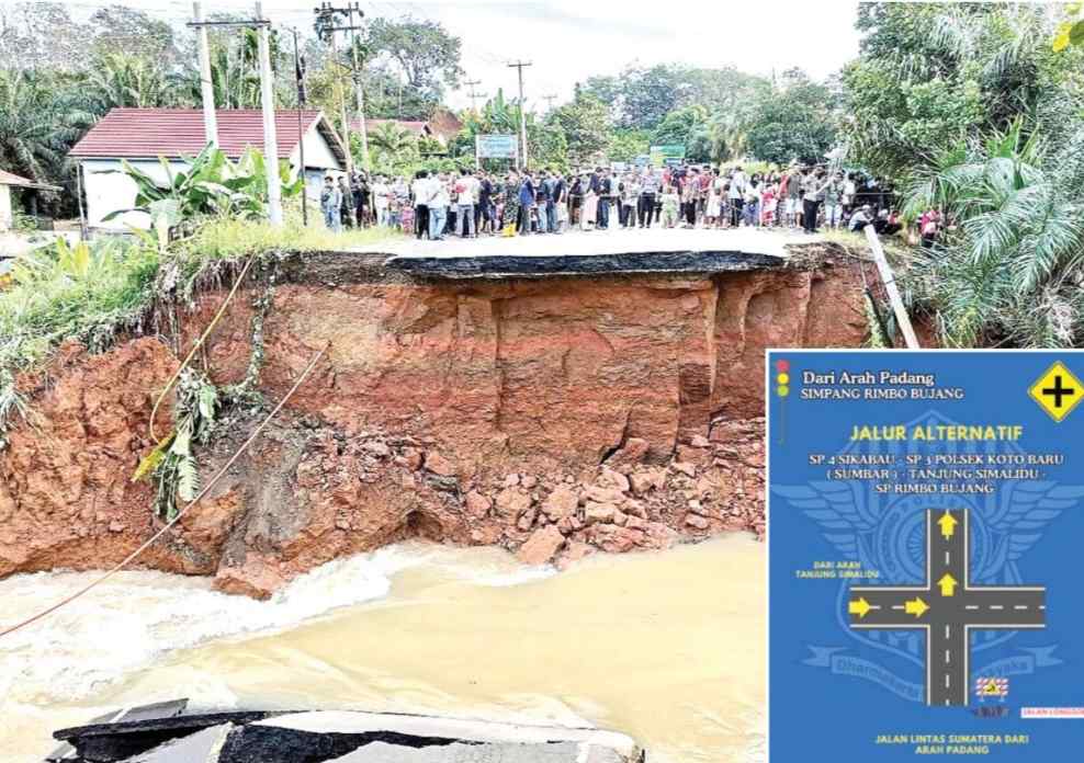 DHARMASRAYA, HARIANHALUAN.ID- Jalan Lintas Sumatera (Jalinsum) yang menghubungkan Sumatera Barat (Sumbar) dengan Jambi, tepatnya di dekat Simpang Ratu Balqis, Desa Sirih Sekapur, Kecamatan Jujuhan, Kabupaten Bungo, Jambi, terputus total akibat dihantam air bah pada Minggu (2/3) siang.