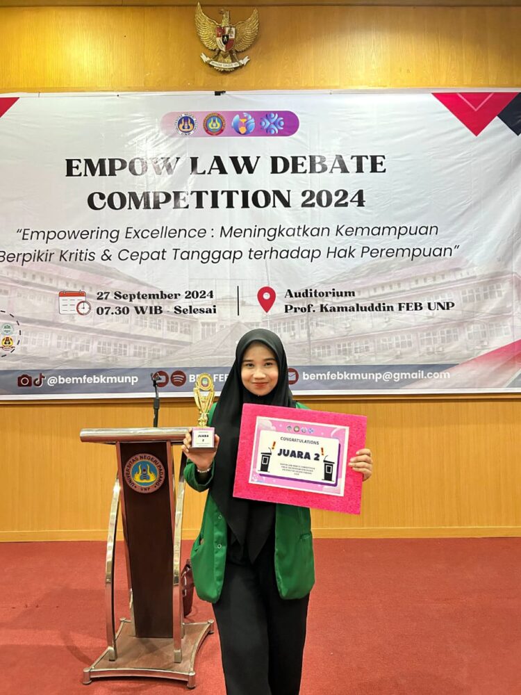 “Selain itu, pada tahun 2024, saya menjadi salah satu peserta Debat Mimbar Mahasiswa di Padang TV, menjadi MC Grand Final Pemilihan Duta Genre Kabupaten Solok 2024 dan meraih juara I Lomba Karya Tulis Ilmiah Internal Kombad Justitia 2024 serta harapan I Lomba Karya Tulis Ilmiah Unimal Constitutional Week II Tingkat Nasional pada tahun yang sama,” tutur Naila.
