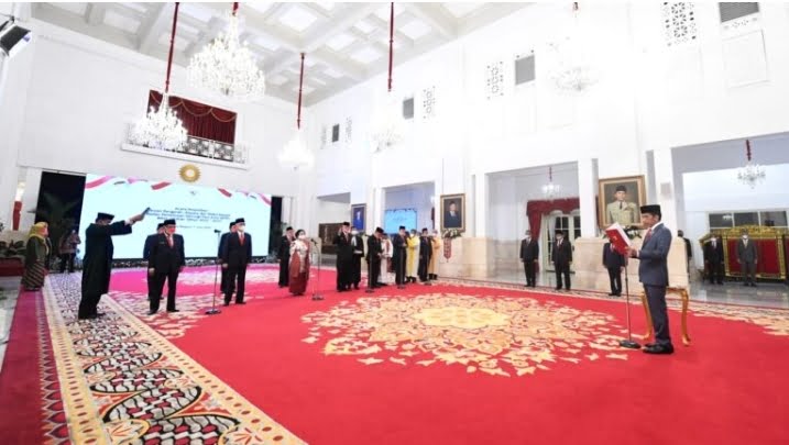 HALUANNEWS, JAKARTA – Presiden Joko Widodo melantik dan mengambil sumpah Dewan Pengarah, Kepala, dan Wakil Kepala Badan Pembinaan Ideologi Pancasila (BPIP) periode 2022-2027 di Istana Negara, Jakarta, pada Selasa, 7 Juni 2022. Acara pelantikan berlangsung secara terbatas dengan tetap menerapkan protokol kesehatan ketat.