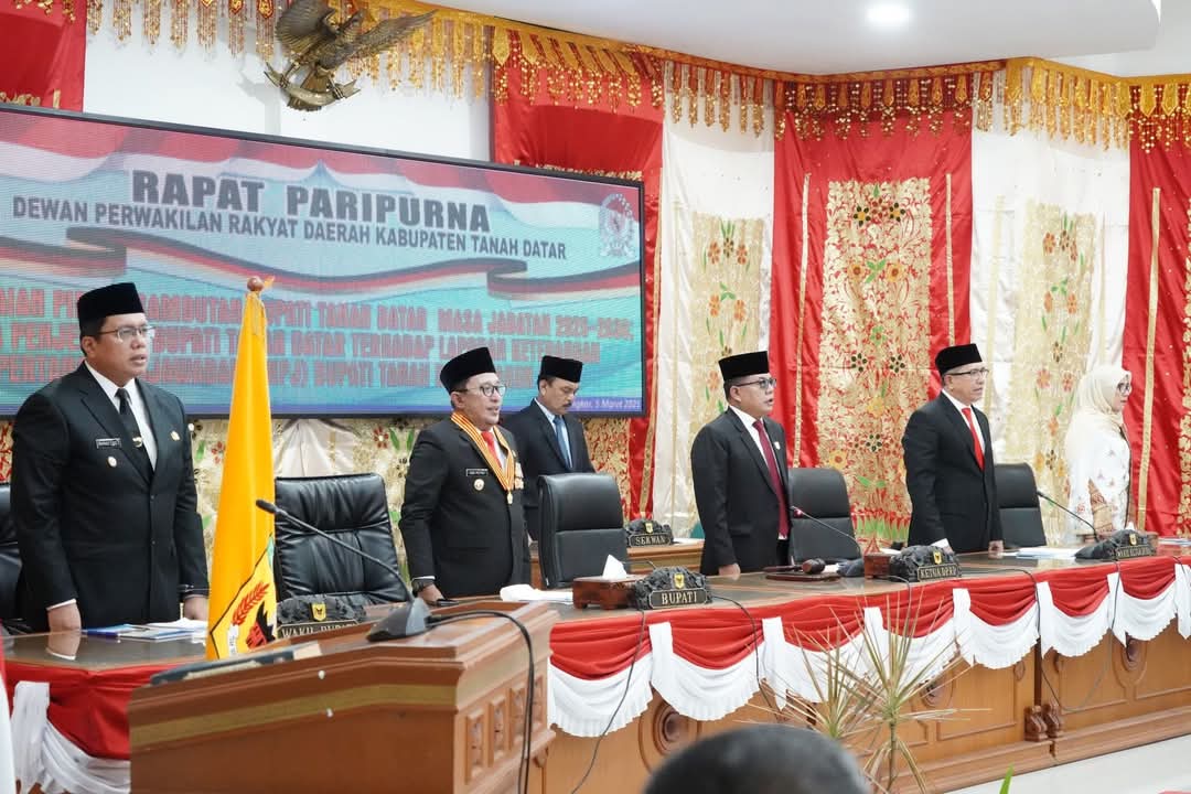 BATUSANGKAR, HARIANHALUAN.ID- Bupati Eka Putra menyampaikan Nota Pengantar Laporan Keterangan Pertanggungjawaban (LKPj) Tahun 2024 pada Rapat Paripurna DPRD Tanah Datar, Rabu (5/3/2025).