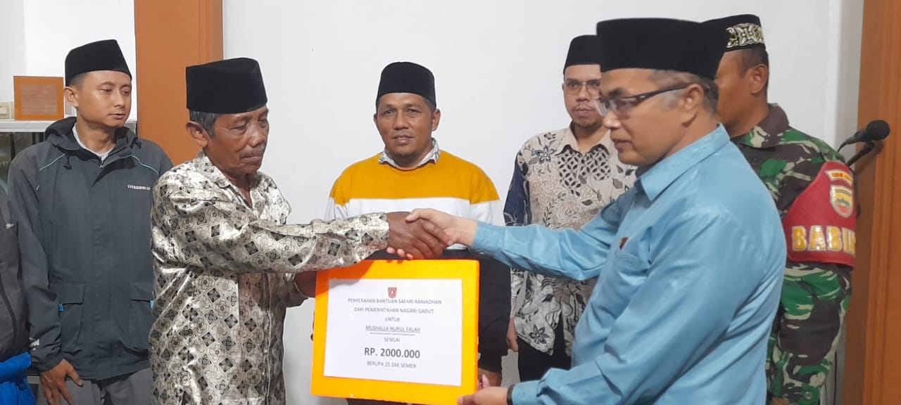 Ketua TSR Nagari Gadut dalam kunjungan ke Musala Nurul Falah , uwardi mengatakan, pada safari Ramadan kali ini pemerintahan Nagari Gadut menyerahkan bantuan berupa semen sebanyak 25 sak.