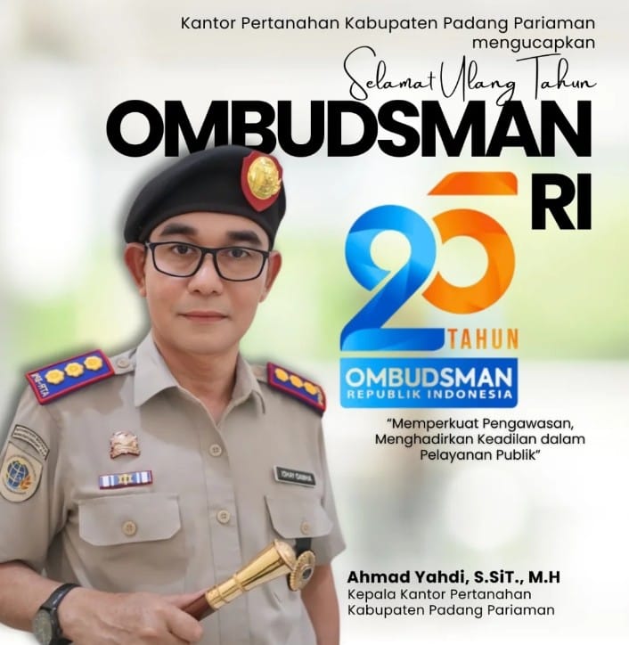 PADANG PARIAMAN, HARIANHALUAN.ID – Kantor Pertanahan (Kantah) Padang Pariaman menyampaikan ucapan selamat ulang tahun ke-25 untuk Ombudsman Republik Indonesia (RI).