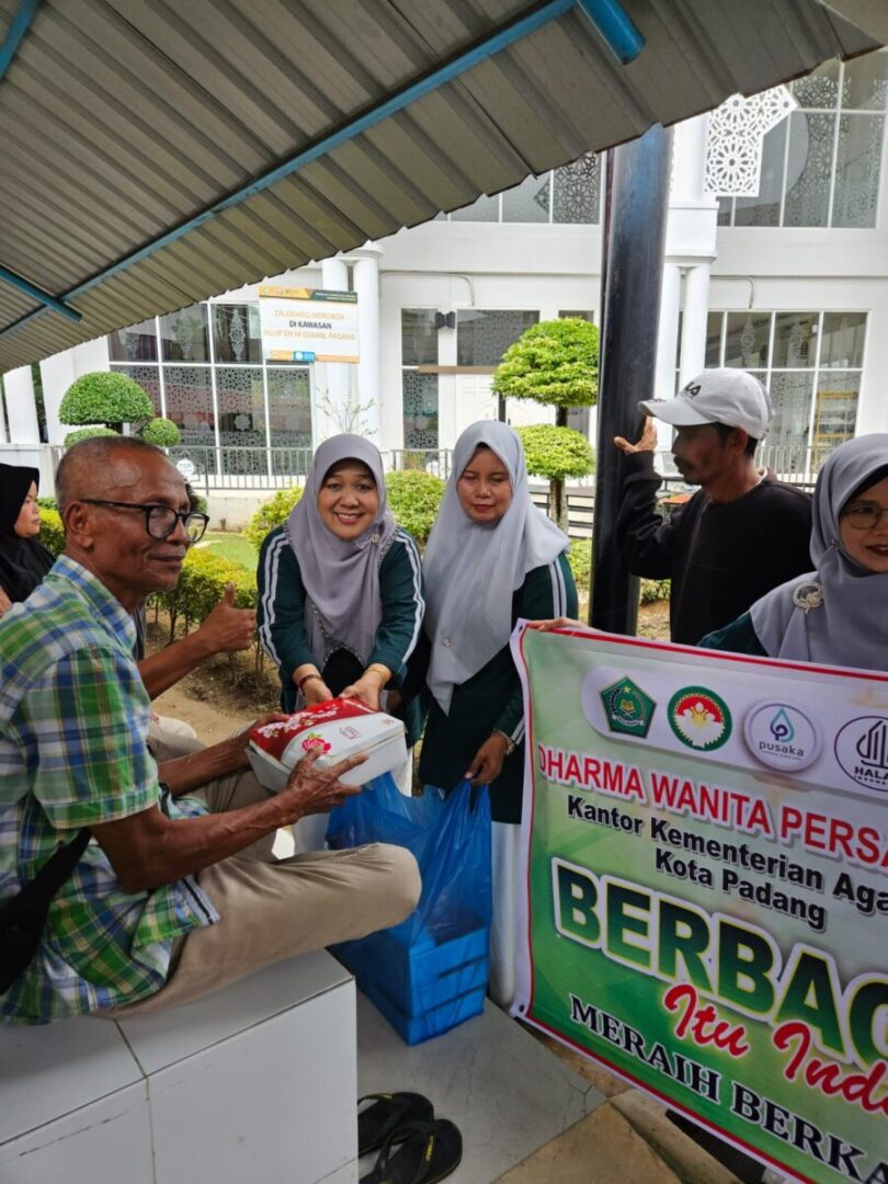 HARIANHALUAN. ID – Dalam rangka Festival Ramadhan 1446 H/ 2025 M Kementerian Agama (Kemenag) 2025, Dharma Wanita Persatuan (DWP) Kankemenag Padang turut berbagi takjil kepada dhuafa dan penunggu pasien di RSUP M. Djamil Padang, Jumat 21 Maret 2025