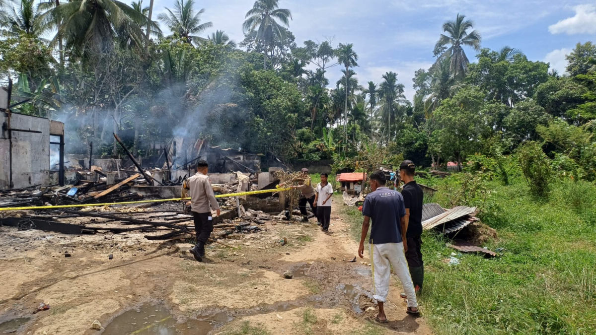 Keterangan Foto: Pihak Kepolisian memasangkan garis polisi di lokasi kejadian kebakaran yang menghanguskan satu unit rumah kontrakan, Sabtu (29/4) di Jorong Pasar Kenagarian Sijunjung Kecamatan Sijunjung. OGI
