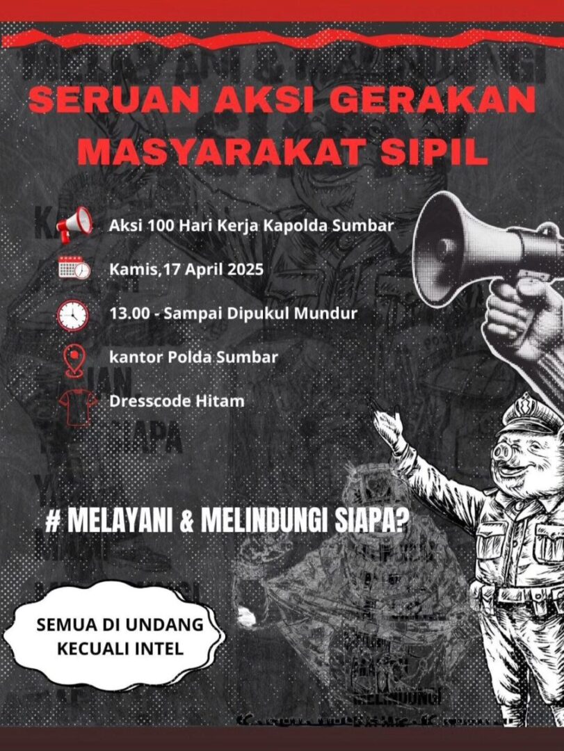 PADANG, HARIANHALUAN.ID – Sejumlah elemen masyarakat sipil berencana menggelar aksi demonstrasi sebagai bentuk evaluasi terhadap 100 hari kerja Kepala Kepolisian Daerah Sumatera Barat (Kapolda Sumbar).