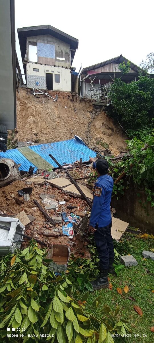 Badan Penanggulangan Bencana Daerah (BPBD) Kota Balikapapan segera melakukan asesmen ke lapangan dan menyerahkan bantuan berupa delapan lembar terpal untuk penanganan darurat. BPBD tengah membersihkan material longsoran di lapangan.