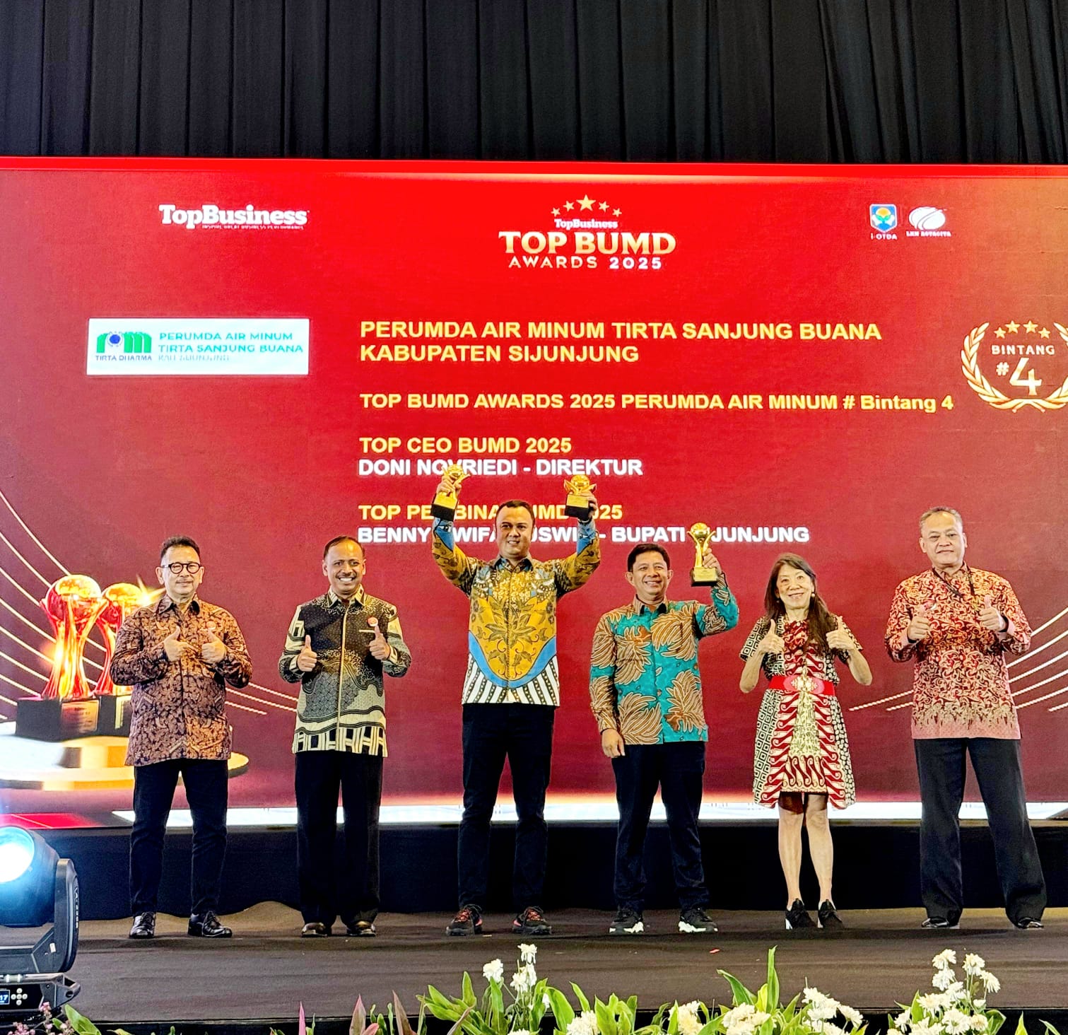 Ketiga penghargaan tersebut berhasil diraih Perumda Air Minum Tirta Sanjung Buana sebagai TOP BUMD Awards 2025 Bintang 4. Penghargaan ini juga diraih Bupati Sijunjung Benny Dwifa Yuswir SSTP, M.Si sebagai TOP Pembina BUMD 2025 dan Direktur Perumda Tirta Sanjung Buana Doni Novriedi sebagai Top CEO BUMD 2025.