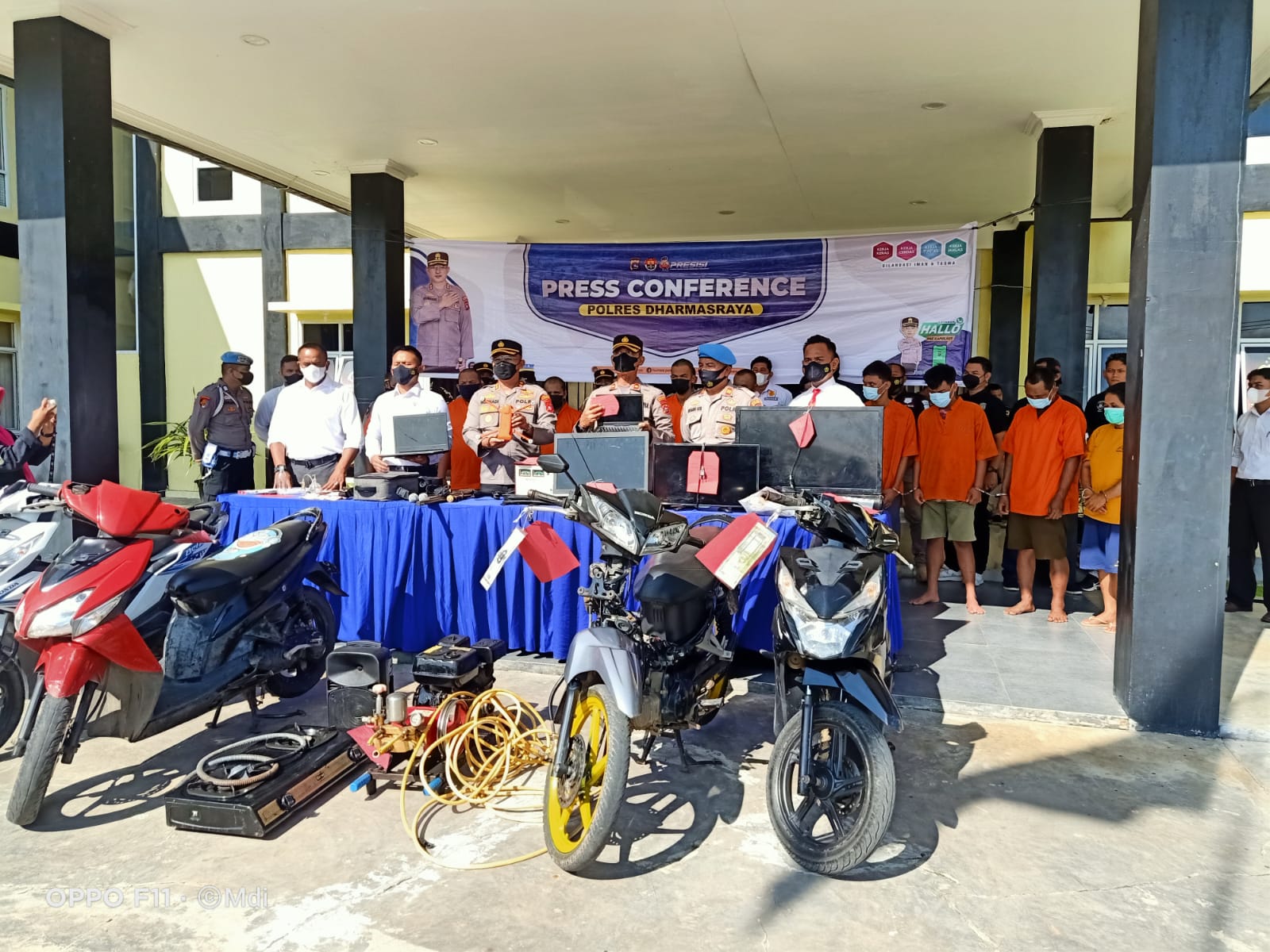“Alhamdulillah berkat dukungan dari masyarakat, kami dari Polres Dharmasraya dapat mengamankan 15 orang pelaku kejahatan dalam 14 kasus,” ungkap Kapolres Dharmasraya AKBP Nurhadiansyah didampingi Kasat Reskrim Iptu.Dwi Angga Prasetiyo dan Kasat Narkoba, Iptu Rusmardi serta pejabat lainnya, Senin (13/06), dalam Pres Confrence di Halaman Mapolres setempat.