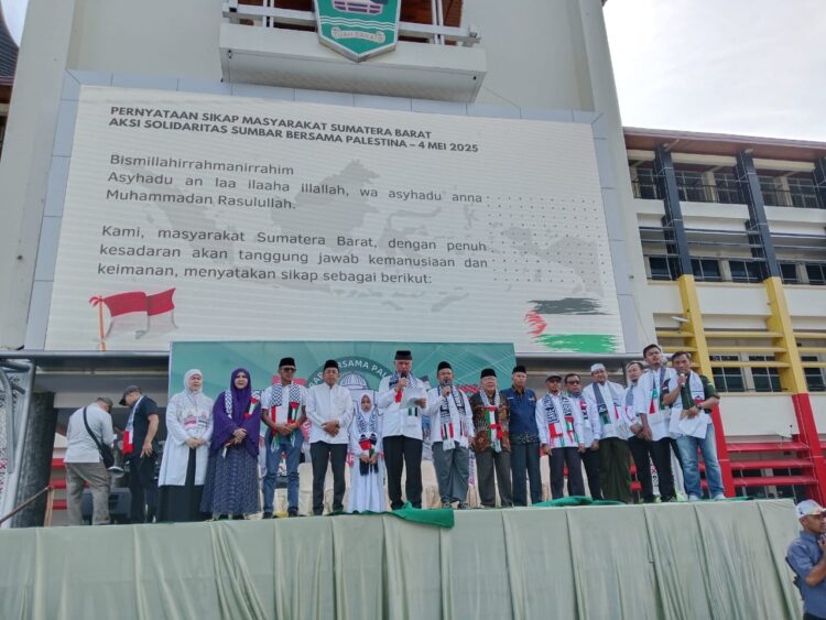 PADANG, HARIANHALUAN.ID – Ribuan warga Sumbar memadati halaman kantor Gubernur Sumbar, Minggu (4/5/2025), dalam aksi solidaritas bertajuk Sumbar Bersama Palestina. Aksi damai ini menjadi wadah bagi masyarakat lintas usia dan kalangan untuk menunjukkan kepedulian terhadap nasib rakyat Palestina.